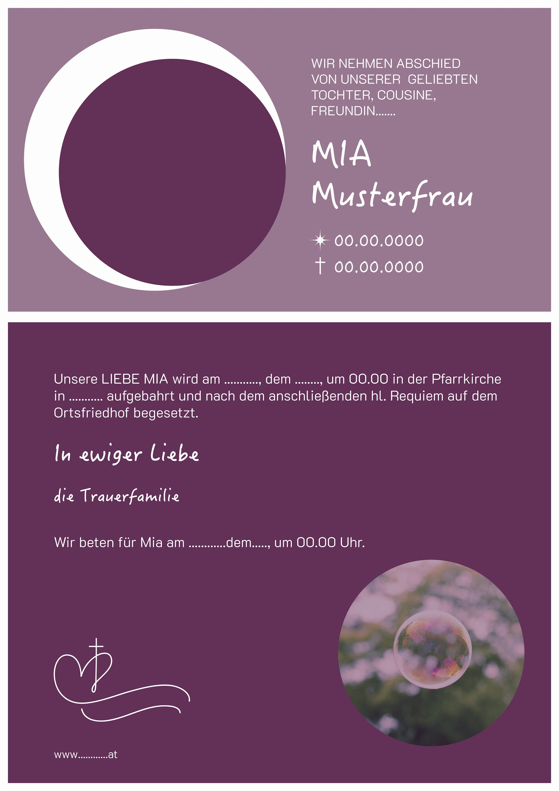 Unsere Designs bieten einen frischen gestalterischen Zugang, klare Struktur und sofortige Einsetzbarkeit – ganz ohne Grafikprogramm. Das Designpaket wird als bearbeitbare PDF-Vorlage bereitgestellt und enthält eine A4-Parte, eine kleinere Parte zum Falten sowie ein Erinnerungsbild. Name und Foto lassen sich individuell anpassen, sodass Bestatter das Motiv beliebig oft verwenden können. Mit Feingefühl gestaltet und professionell aufbereitet, ermöglicht die Vorlage eine würdevolle, flexible und zeitsparende Gestaltung von Trauerdrucksorten. Die Datei wird nach dem Erwerb digital und bequem zur Verfügung gestellt – bereit für stilvolle Abschiede mit persönlicher Note.